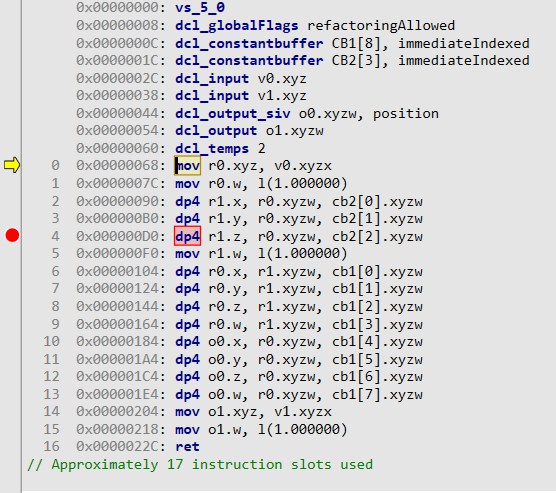 debug mode로 빌드하여 debugging info를 포함하고 있는 프로그램은 원본 쉐이더 코드도 볼수 있다.