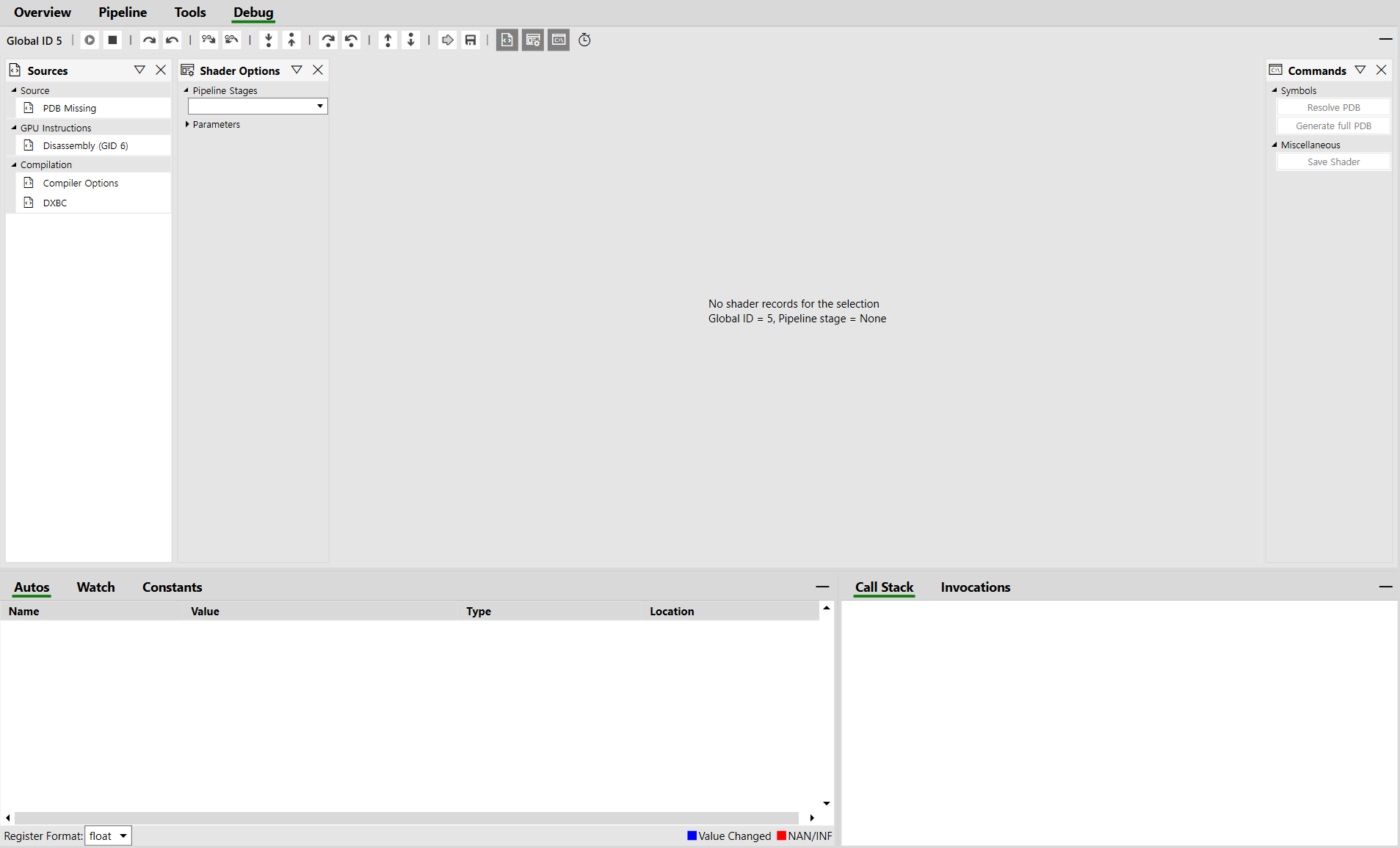 주의: Pipeline 혹은 Tools에서 명령어를 선택해야 디버깅을 할 수 있다.