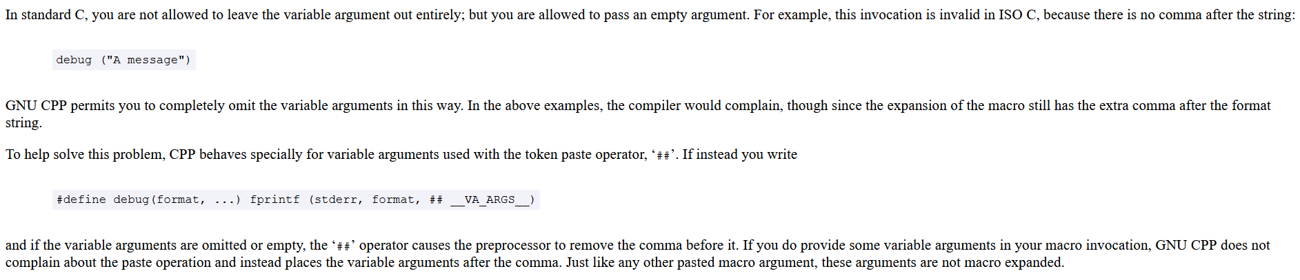 하지만 GCC에선 __VA_ARGS__ 앞에 오는 경우에는 token pasting operator로써가 아닌 이와 같이 가변 인자의 개수가 0일 때 콤마를 지우는 역할을 하도록 되어 있는 듯 하다.