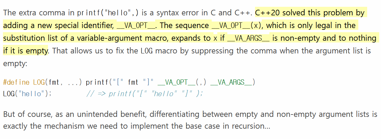 추가로 재밌는 사실은, 기존에 비표준이었던 __VA_OPT__가 C++20에서 채택되었기 때문에 C++20부터는 더이상 ## 연산자를 사용하지 않아도 된다!