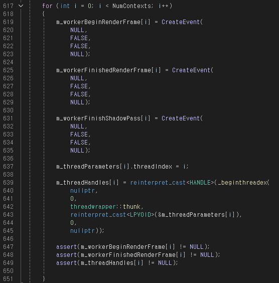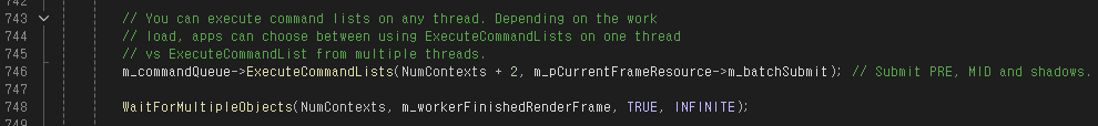 NumContexts * 2 + CommandListCount 라고 되어 있는데, NumContexts * 2는 각 쓰레드마다 Shadow Pass, Scene Pass를 위한 Command List 2개씩 가지고 있기 때문이고, CommandListCount는 stdafx.h에 3으로 정의되어 있는데, 메인 쓰레드에서 사용하는 Pre, Mid, Post Command List를 위한 것이다.