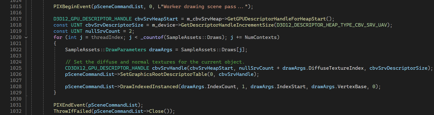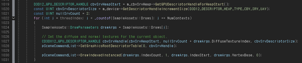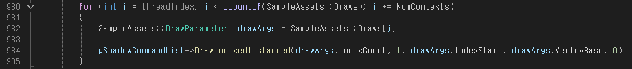 Scene pass의 코드를 보면, (Shadow pass도 마찬가지이므로 어느쪽을 봐도 상관없다) InstanceCount가 1이므로 인스턴싱은 하지 않고 있고, SampleAssets::Draw 배열을 순회하며 DrawIndexInstanced() 함수를 호출하고 있는 것을 볼 수 있다.