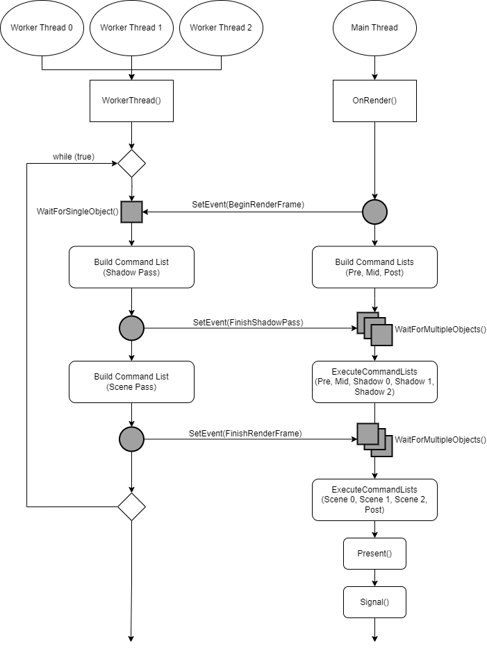 이제 Shadow Pass를 위한 작업들을 완료하고 Scene Pass로 넘어갈 준비가 되었으므로 모든 쓰레드가 Shadow Pass에서 사용할 Command List를 만들 때까지 기다린다.