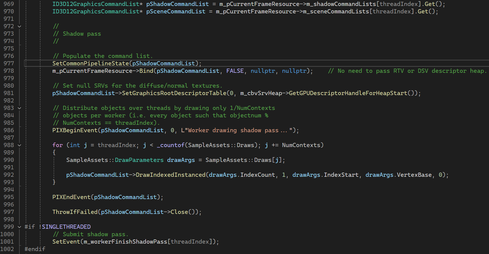 의문인 점은 실제로 그려지는 메시가 여러개임에도 Vertex Buffer는 단 하나만 생성하고 있는 것인데, (바로 다음에 생성하는 Index Buffer도 단 하나만 생성하고 있다) 실제로 Draw Call이 일어나는 D3D12Multithreading::WorkerThread() 함수를 살펴보면 이유를 찾을 수 있다.