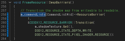 FrameResource::SwapBarriers() 함수에서는 Shadow Texture의 상태를 전환한다. Shadow Pass에서는 Depth Buffer 용도로 사용했지만 Scene Pass에서는 픽셀 쉐이더에서 쓰이는 텍스쳐 리소스여야 하기 때문이다.