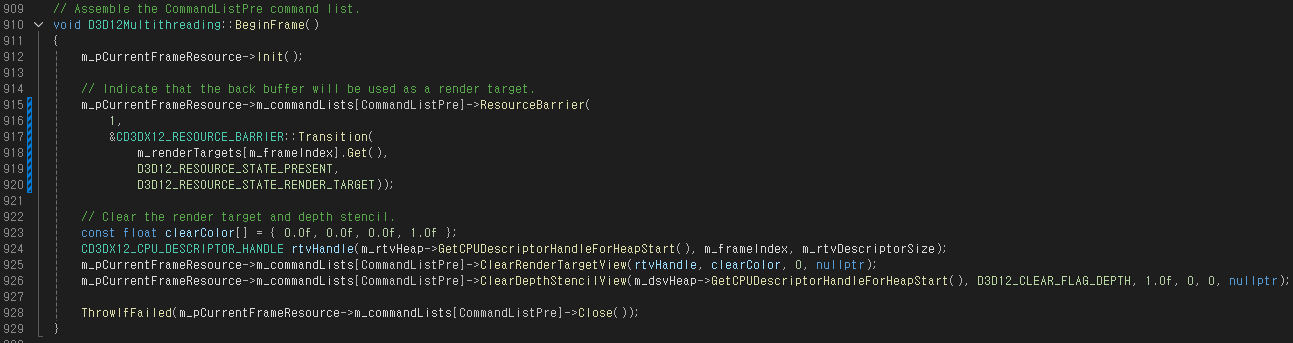 ID3D12GraphicsCommandList::ResourceBarrier() 함수 호출 부분이 너무 길어 추가로 줄바꿈을 하였다.