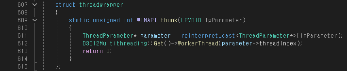 thunk 함수 내에서 호출하는 D3D12Multithreading::WorkerThread() 함수가 Multithreaded Rendering의 핵심적인 역할을 하는 함수이다.
