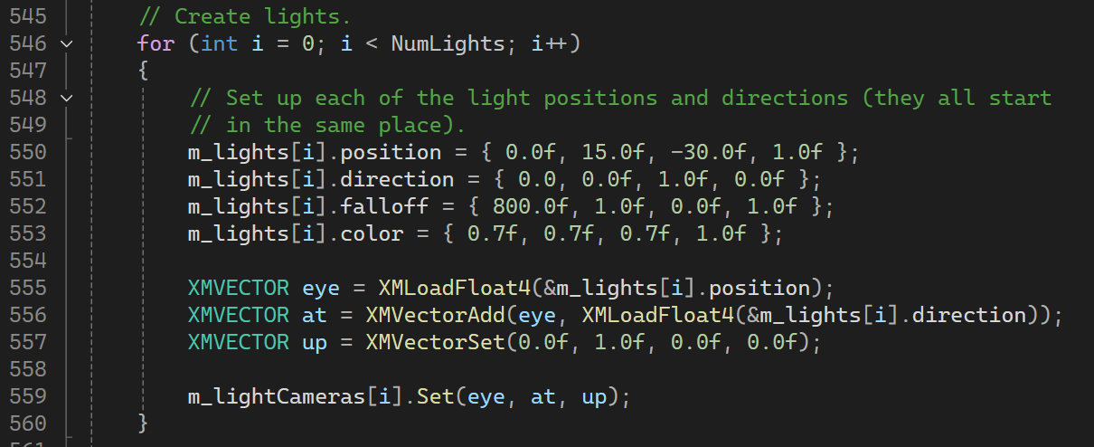 D3D12Multithreading::LoadAssets() 함수에서 광원에 대한 정보를 초기화하고 있다.