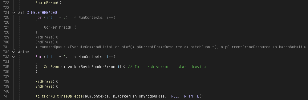 이 작업들이 끝나면 실질적은 Draw Call을 해주게 되는데, 이 예제에서는 전체 메시중 자신의 Thread Index의 배수 인덱스에 위치한 메시에 대해서만 Draw Call을 해주는 것으로 쓰레드간 작업 분담을 구현하고 있다.