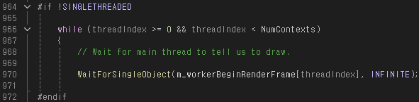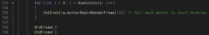 이후 BeginRenderFrame 이벤트를 활성화한다. 이 이벤트는 WorkerThread() 함수의 시작 부분에서 Wait하는데, 잠깐 제쳐두고 MidFrame(), EndFrame() 함수에 대해서 먼저 살펴보자.